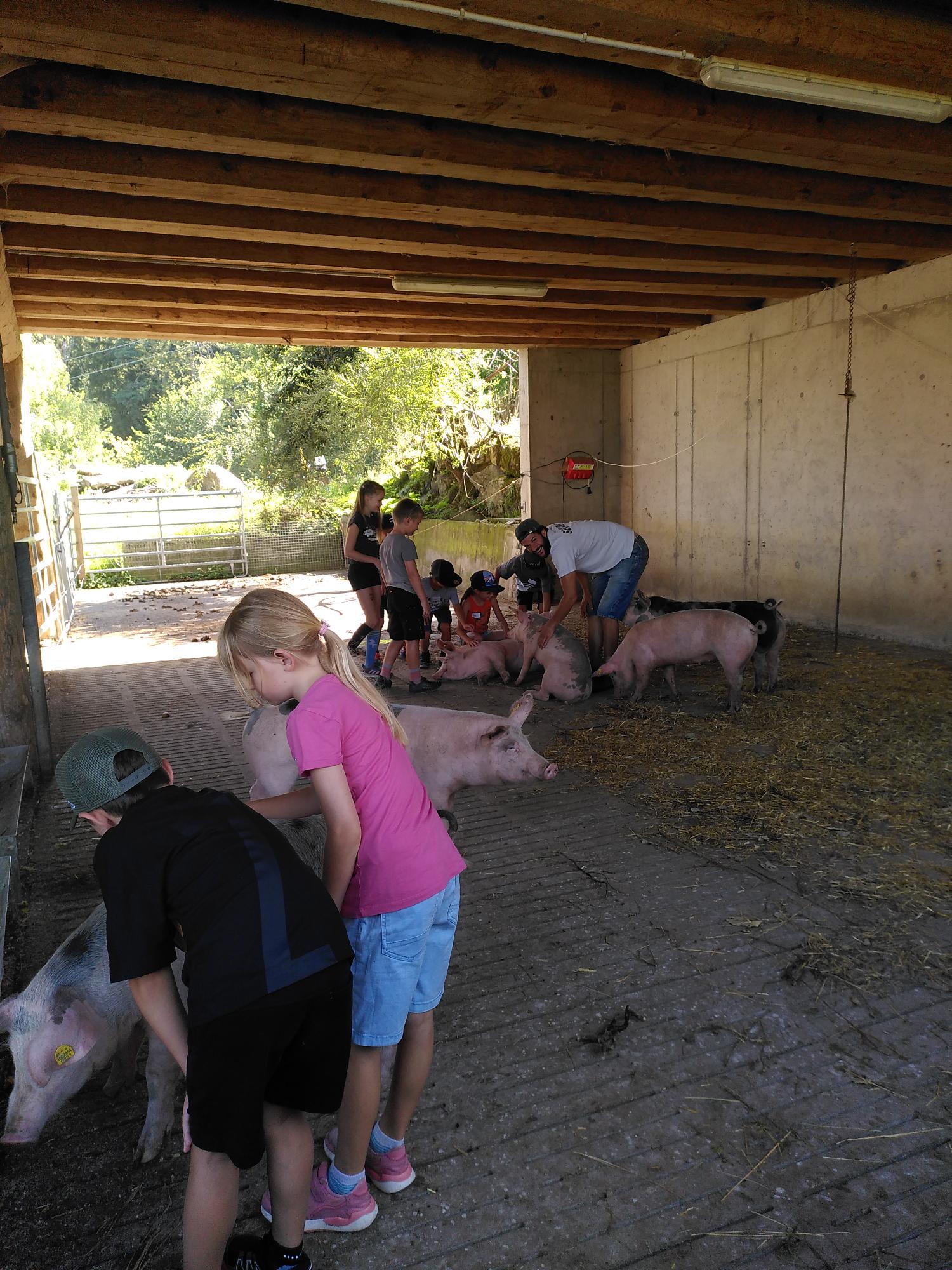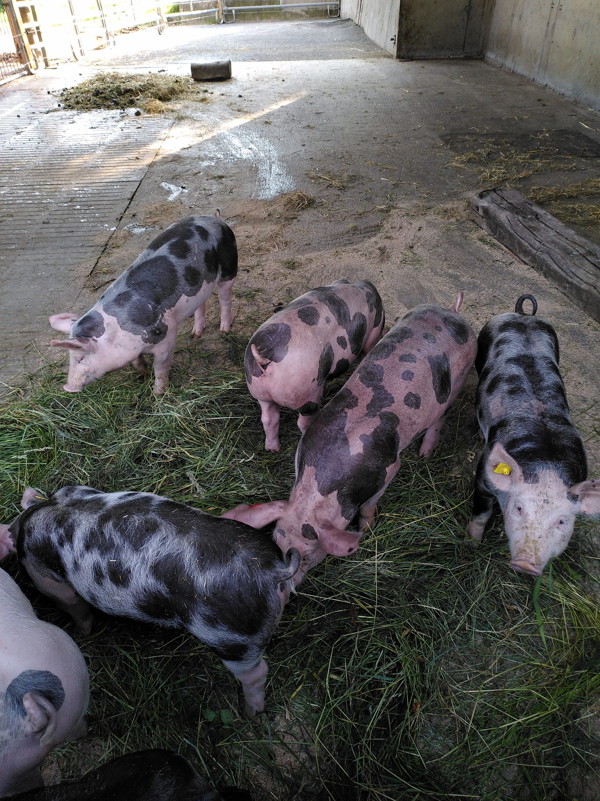 Zusätzlich zum herkömmlichen Biofutter erhalten unsere Schweine außerdem täglich „Snacks“ – zum Beispiel frisches Gras, Heu, Blätter oder ähnliches, um herumzuwühlen, zu futtern und sich so die Zeit zu vertreiben. Schweine verbringen nämlich, wenn sie die Möglichkeit dazu haben, einen Großteil des Tages damit, ihre Umgebung zu erkunden und nach Futter zu suchen. Das ist ein glückliches Schweineleben!